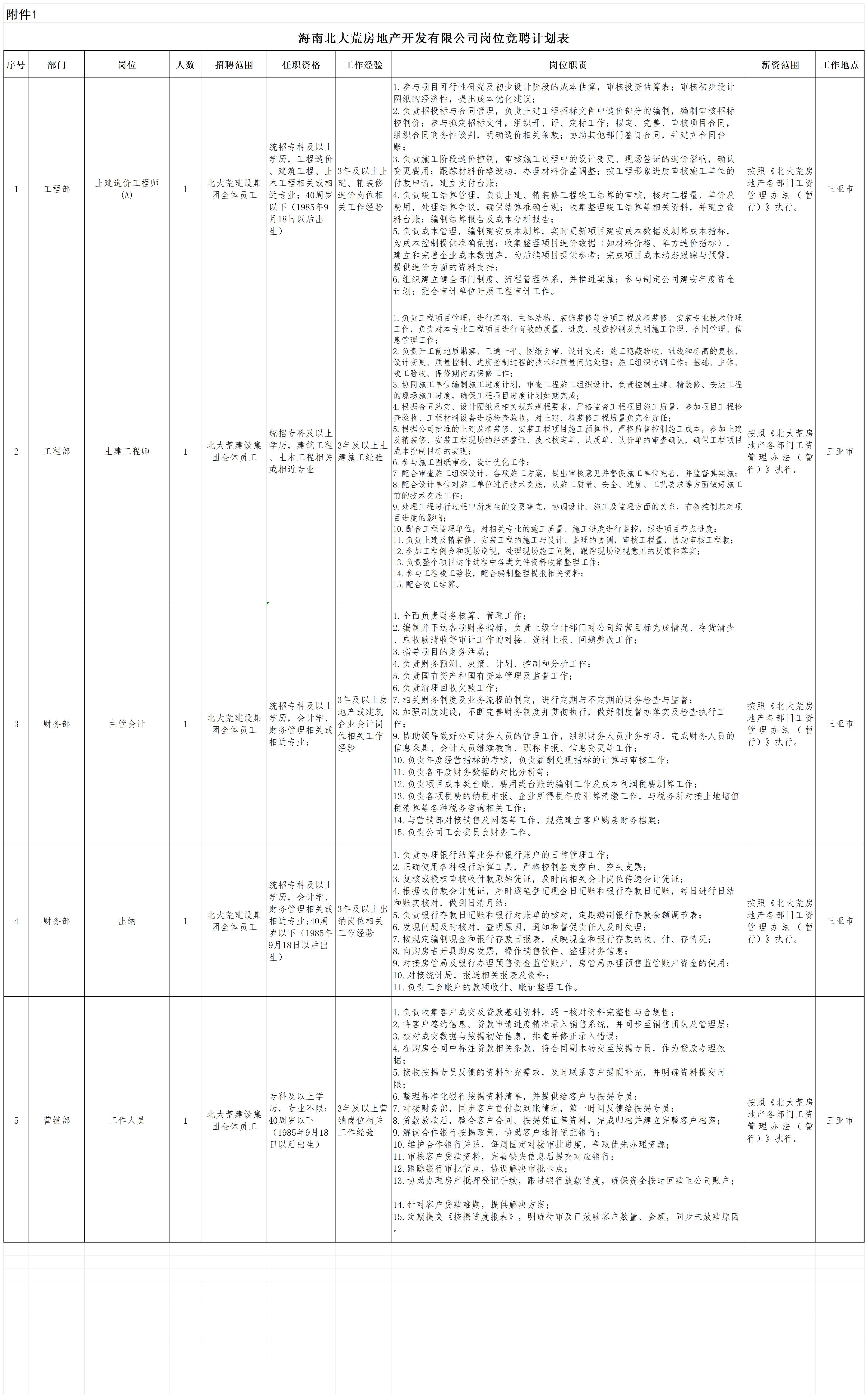 海南北大荒房地产开发有限公司共计5个岗位。竞聘岗位、任职资格、工作经验及岗位职责等信息,详见《岗位竞聘计划表》(附件1)。