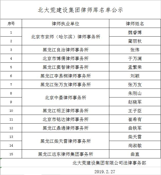公示期间为2019年2月27日至2019年3月1日。有何意见,请及时向北大荒建设集团法律事务部反映。